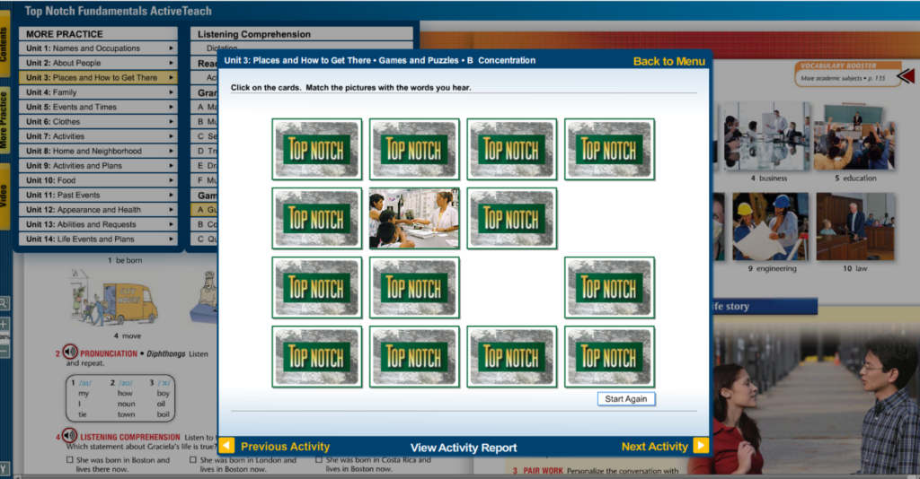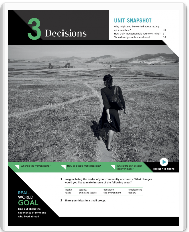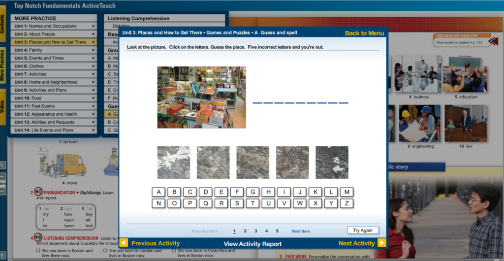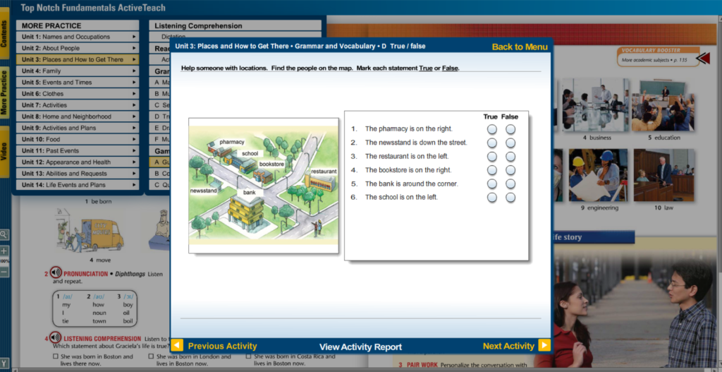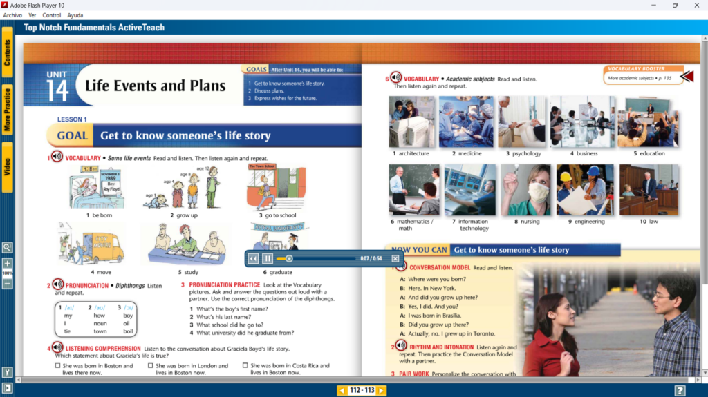 Es un paquete de herramientas de seis niveles que permite a los estudiantes jóvenes y adultos unirse a cualquier conversación y decir lo correcto en el momento adecuado. El libro electrónico Wide Angle Student Book tiene funciones interactivas diseñadas para estudiantes de idiomas. Se mira el video y se escucha el audio directamente desde el Oxford Bookshelf. Se realiza las actividades directamente desde la pantalla compartida y se comprueba la comprensión con la calificación automática de forma instantánea.